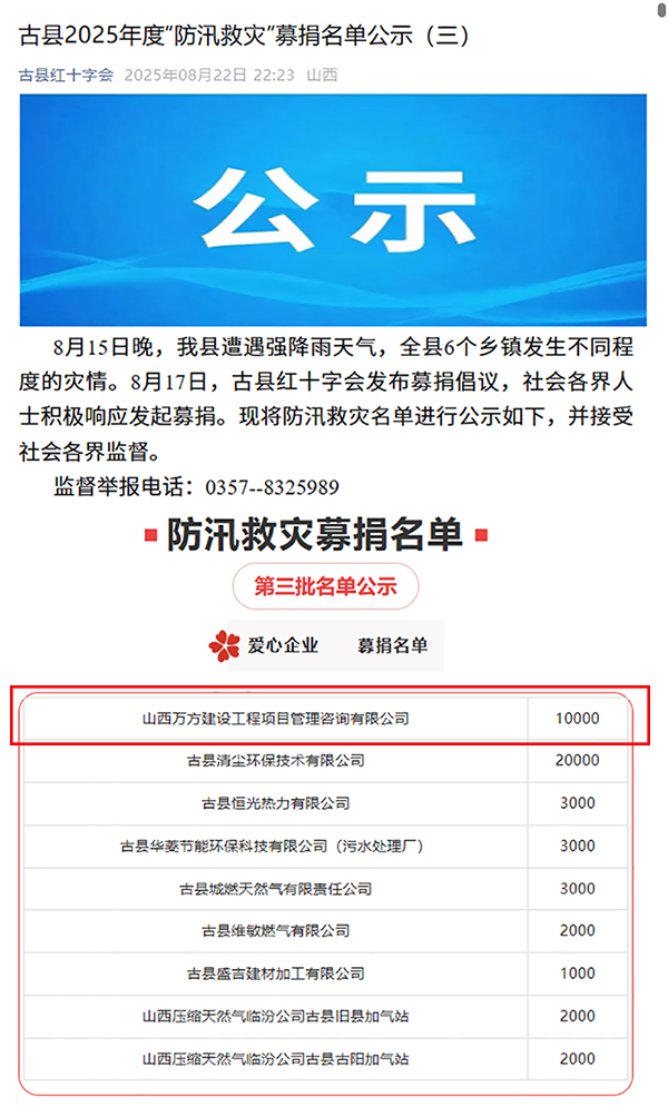 公司积极响应古县红十字会的号召,捐赠善款10000元,全力支持受灾地区的抗洪救援、安置保障及灾后重建工作。一直以来,公司与古县有着紧密的合作项目,在共同发展中,见证了古县的成长与进步,对这片土地满怀深厚情感。此次捐赠,是公司回馈社会的一份责任担当,希望用实际行动向受灾群众献出爱心、传递温情。相信在各方齐心协力之下,古县定能早日战胜洪灾,让家园重现往日的安宁与美好 。